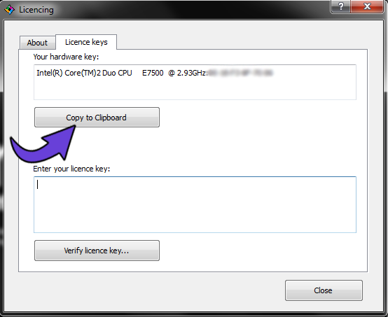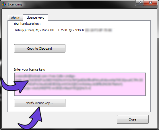 - Paste it back into the Indigo Licence dialog box at the bottom, and press "Verify licence key".