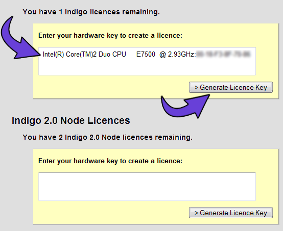 - Scroll down to the bottom section. Paste in your hardware key into the appropriate box, depending on the type of licence you own, and press "Generate Licence Key".