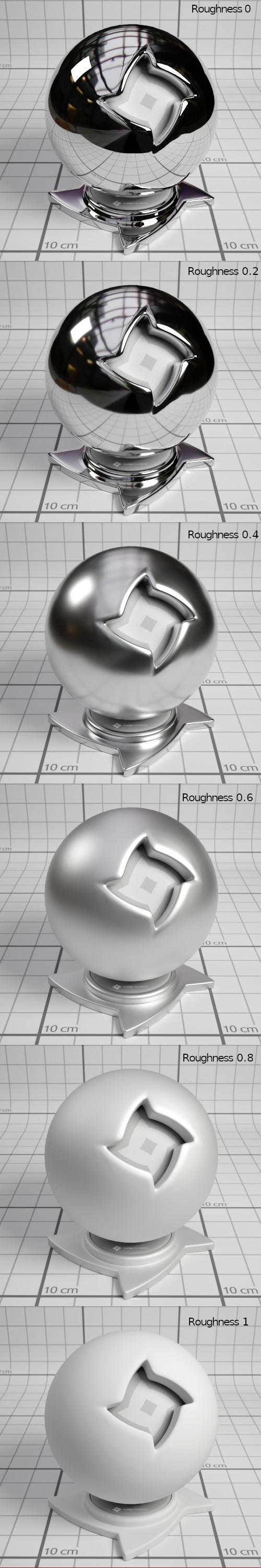 The roughness parameter controls the roughness of the surface, with lower roughnesses corresponding to a smoother, more polished surface with mirror-like reflections.