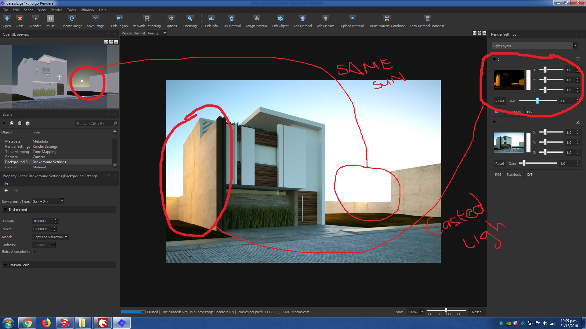 I've been doing some test with this new version and i found that the sun displayed in the " OpenCl preview screen" does not match with the light casted from the sun light layer, i mean ,it seems that i have 2 suns ( or an extra unknown light source) in my scene :