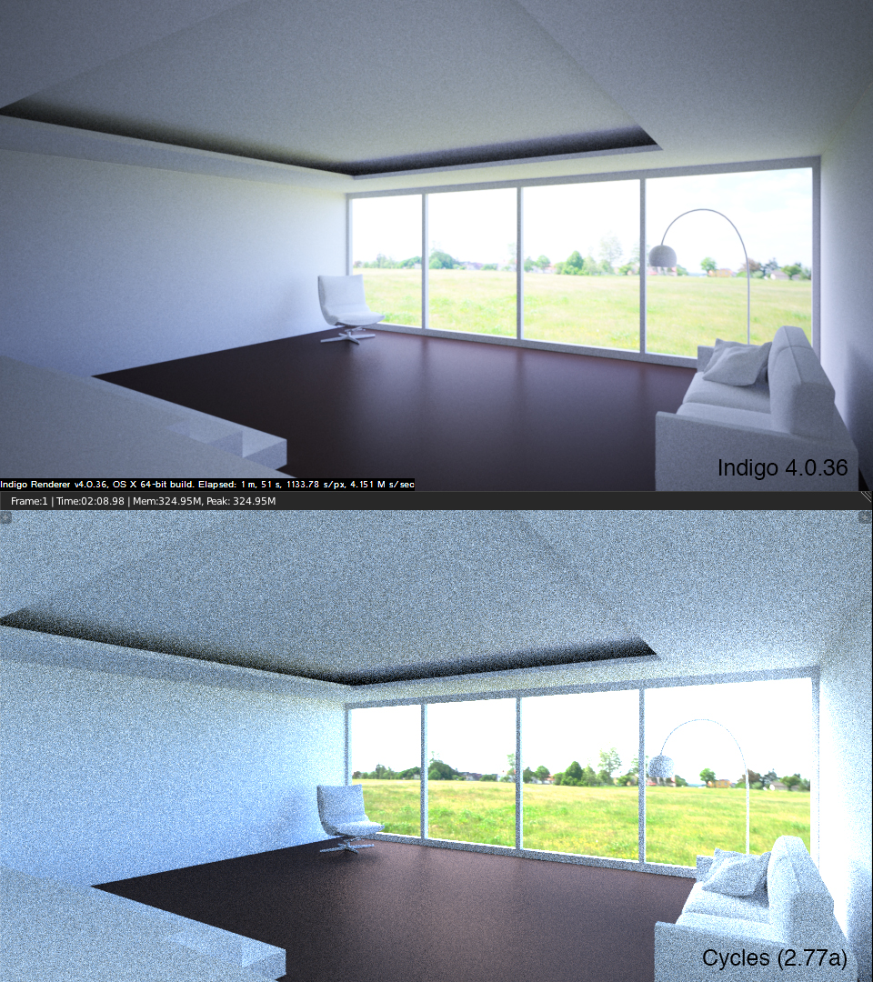 Sure, here are the latest versions of Indigo and Cycles in comparison.