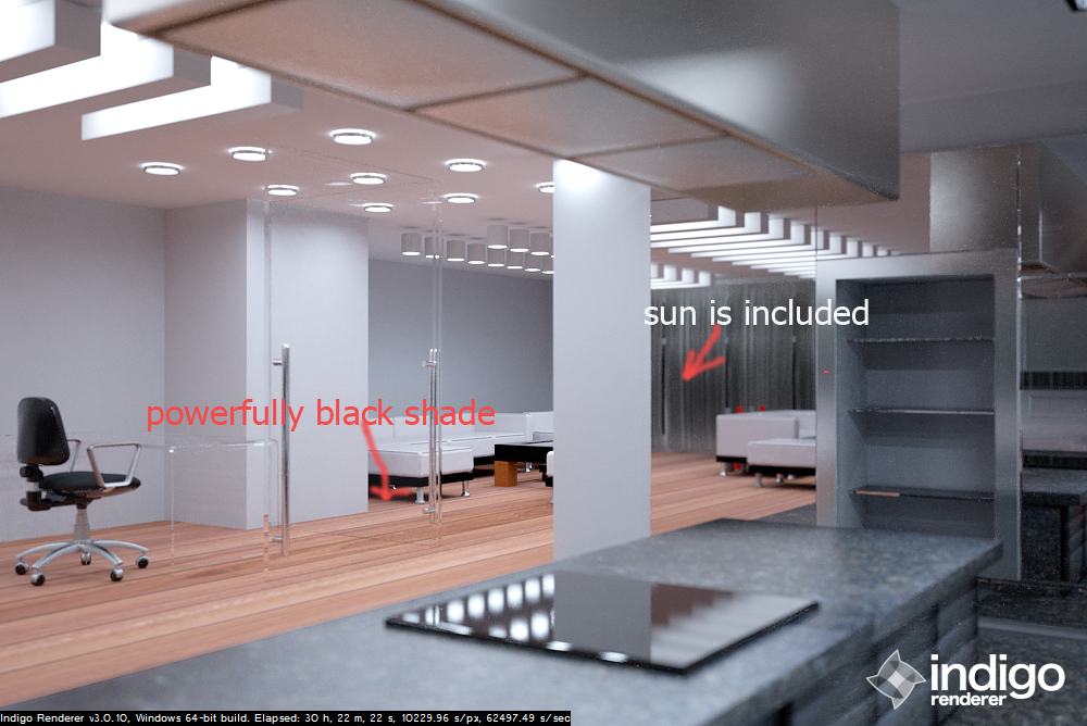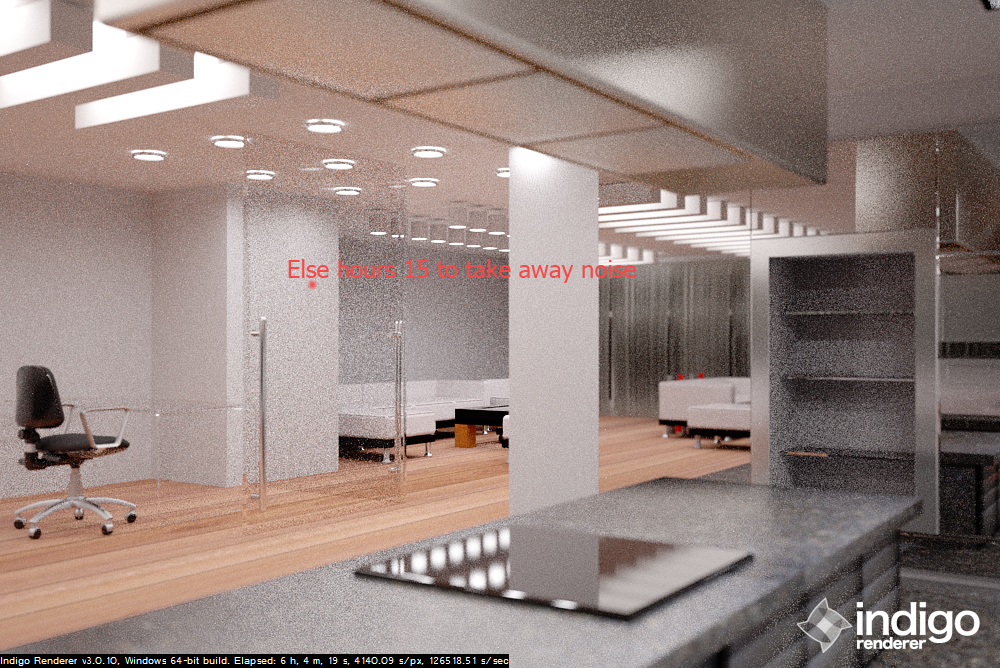 Indigo I am constant any problems I can not to work normally. I cannot understand till now, how works Indigo, it is necessary to reduce emitters as surprises begin. I have already tried all tunings. I any more do not speak about IES files. Now there was version 3.0 рендер, proceeded 30 hours with the permission 1000 668, and the permission 2000 1336 we multiply it for a while on 3 = 90 hours. Before the image miscalculation will begin there pass 30 seconds. There is no material glass. There are no illumination preparations.