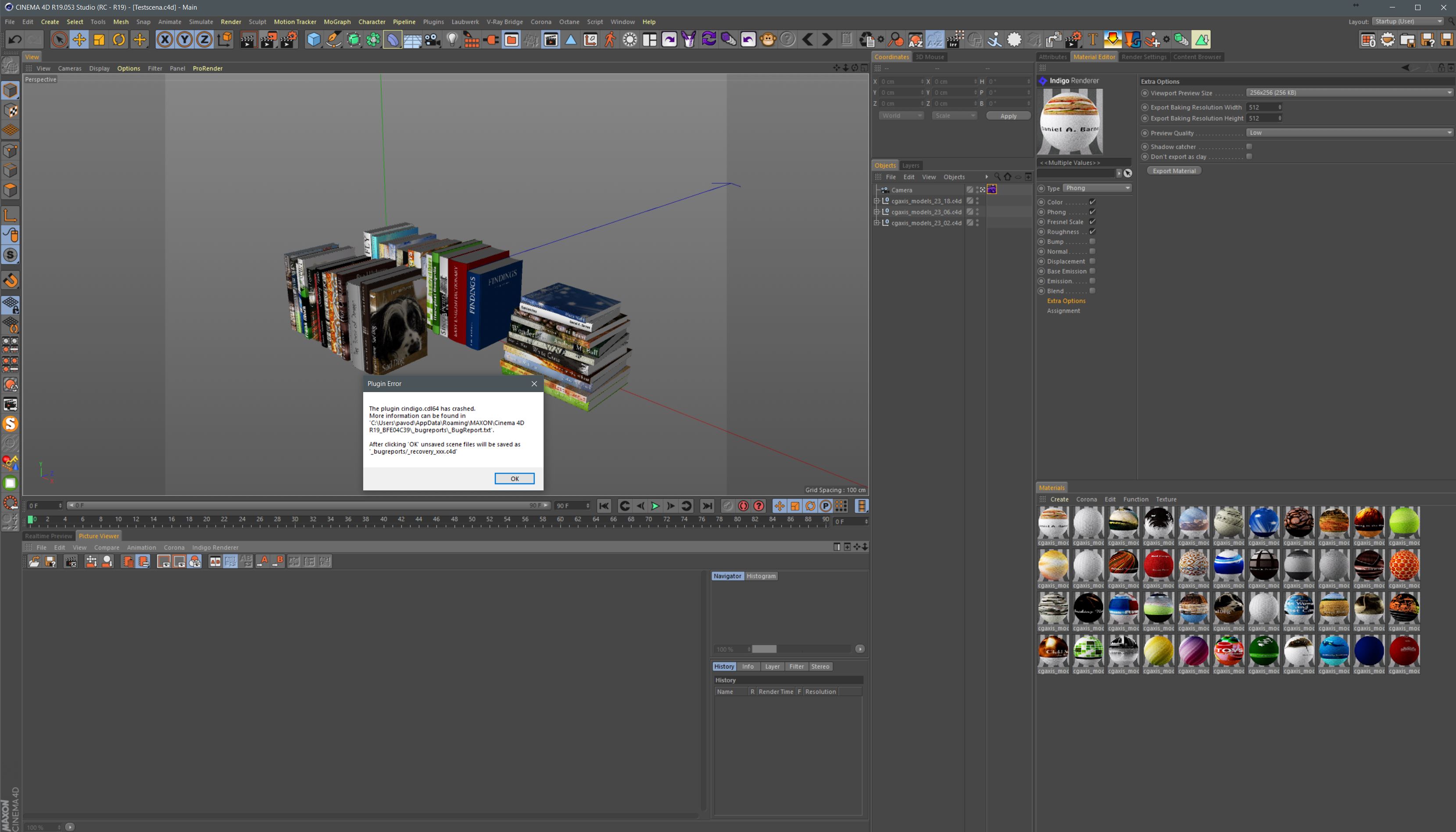 Could you please test my scene in C4D. My problem with crashing the program still persists. This scene contains about 45 textures, which is the amount that leads to frequent program crashes. I tested on three different computers and more versions of C4D and will always crash. It's a pretty complicated job. But export to stand-alone Indigo works well.
