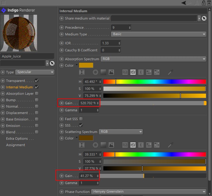 For example, in indigo, apple juice mat's internal medium uses SSS, and the gain value for absorption is 52.0702, the gain value for scattering is 4.127.