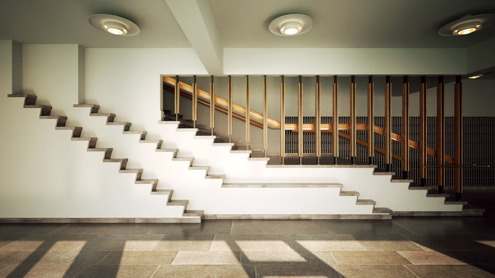 Main stair of department of Architecture, Helsinki University of Technology, Alvar Aalto 1964.