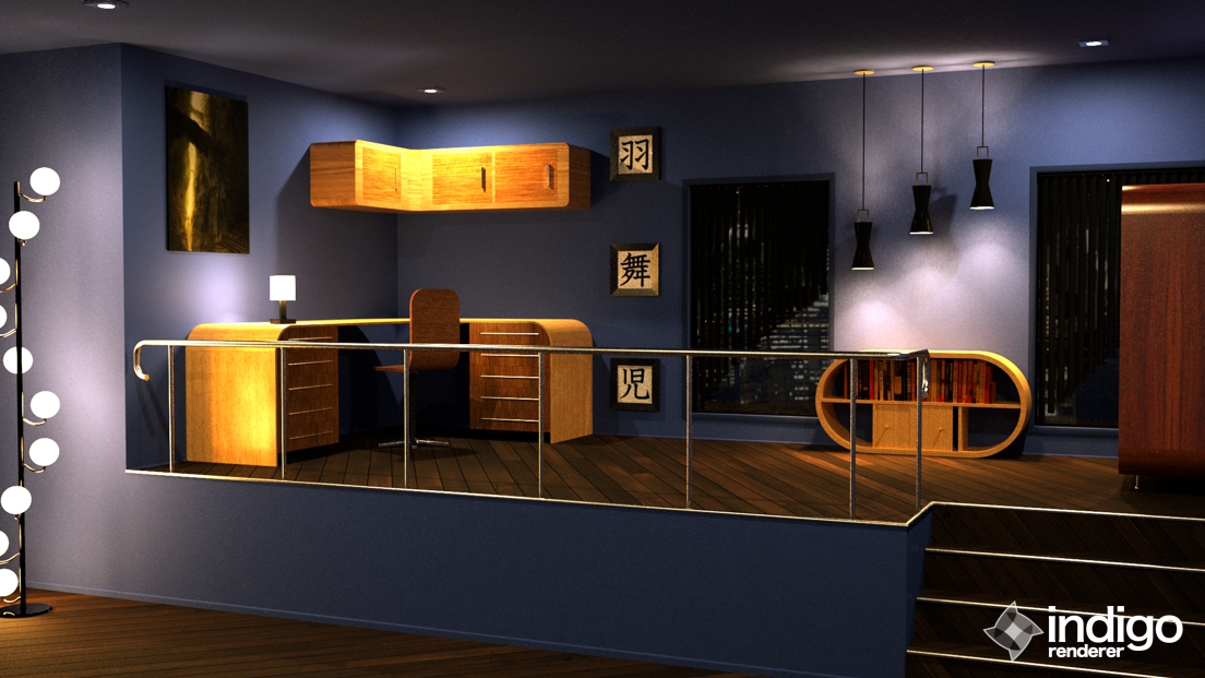 Blender 2.49b, Gimp (for wall texture), Wood materials from database ( A | B | C | D ), desk lamp shade material is from BbB, Book texture & New York photo from flickr, IKEA & Inmod for furniture design ideas (models are mine, but the design/inspiration mostly comes from there). Also the art piece on the wall comes from Jason Roll (Hyper3D) from deviantart, who kindly let me use it.