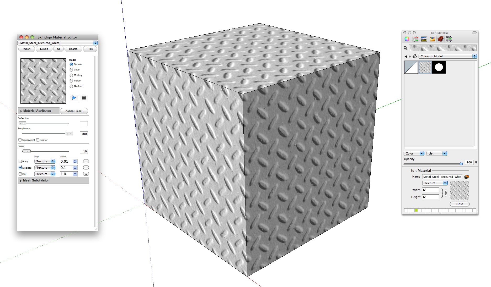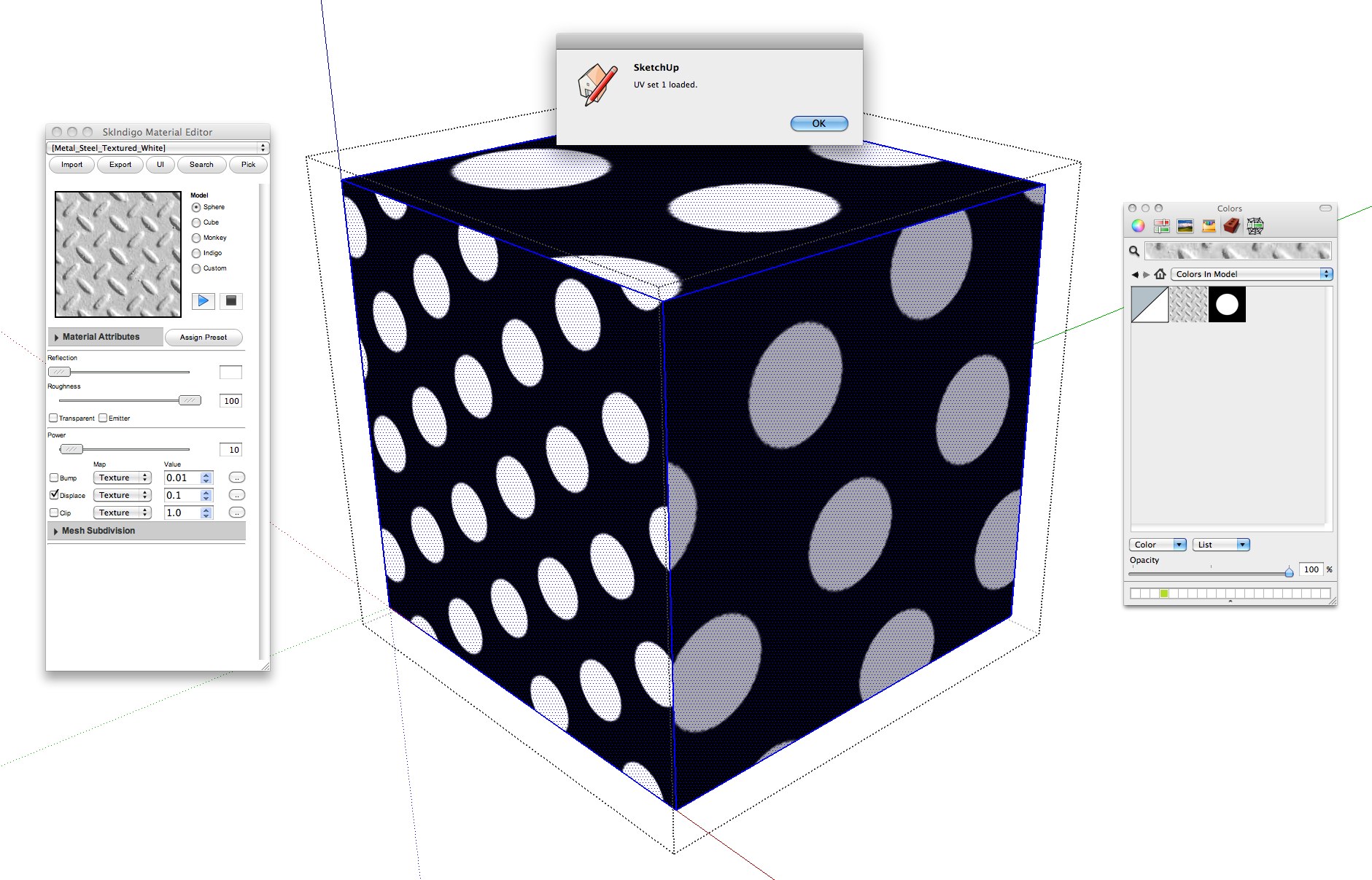 I'm having trouble mapping an external displacement texture to faces with a color material only. I go through all the motions for adding a new external texture, and my positioned displacement map seems to save correctly, but then my map coordinates are always overridden by the SketchUp default coordinates (and the texture is always scaled at 1 unit x 1 unit (I'm in inches)). In short, my texture positions are ignored once rendered.