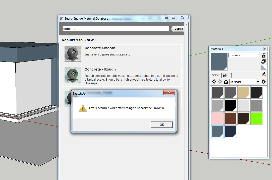 I get similar error message as in this image. When i click search and look for Concrete for instance, it asks me if I want to download the material and when I click yes it brings up a DOS window and tries to unpack and then the error message say that it failed in downloading the material into the project. What am I doing wrong?