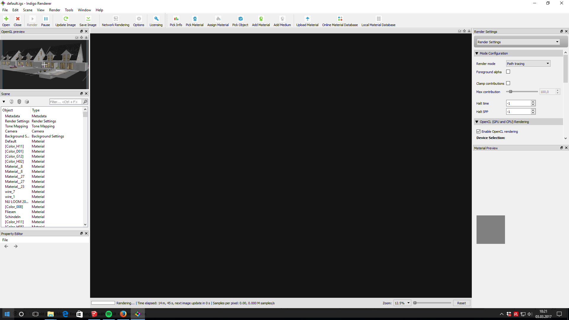 I have a problem with a current project. Since yesterday, the gpu renderer doesn´t start correctly anymore. As usual, it is loading the scene in indigo and the timer is running, but I get no picture, now after 14 minutes it´s still black (added a screenshot). I have renderrd some pictures with this sketchup-file in gpu mode before and everything worked fine. Meanwhile I have added more materials, plants and so on. May this be the problem?