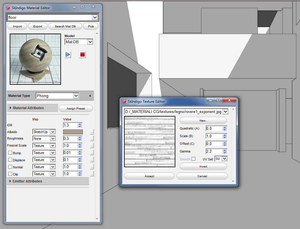 Also, the roughness numeric parameter receinved by Indigo doesn't seem to be related to the one set inside SketchUp: should it?(Skindigo value for roughness was 0.3, in Indigo it was translated into about 0.52, is that behaviour correct?)