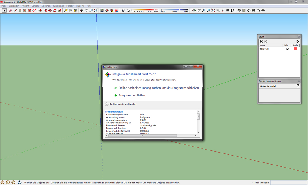 same problem as before. after the new installation of indigo renderer and skindigo i got a note, that the trial mode begins. hitting OK and starting a render brings the same failure again.