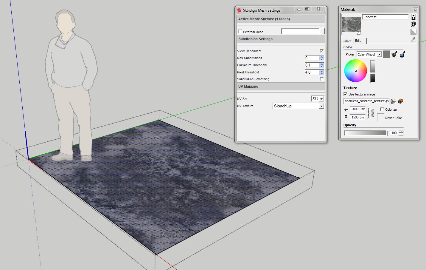 STEP 1 To start then, we have Derek stood by a square of concrete. Lucky Derek. Its just a simple plane with a texture applied in the material editor. STEP 2 Now, select the plane, press G to open the component dialogue box and make it a component. Call it whatever you like. Now, double click on your new component and right click the concrete and select 'EDIT ACTIVE MESH' under the SKIndigo heading. You get this dialogue box pop up: Max subdivisions runs from 1-9 and governs your displacement quality. I tend to set mine to 9 as it gives me the best results, although I hear that this might be overkill. Set this value to whatever works for you. Leave Curvature threshold, pixel threshold etc as their defaults.