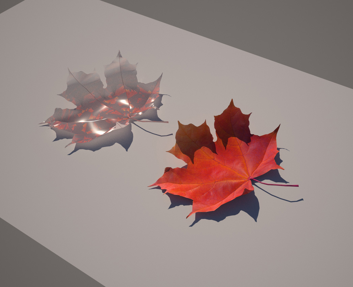 The r_f get mapped with a "thickness map" that let leaf vains etc. let less light pass. Brighter colors are marking more transmission here.