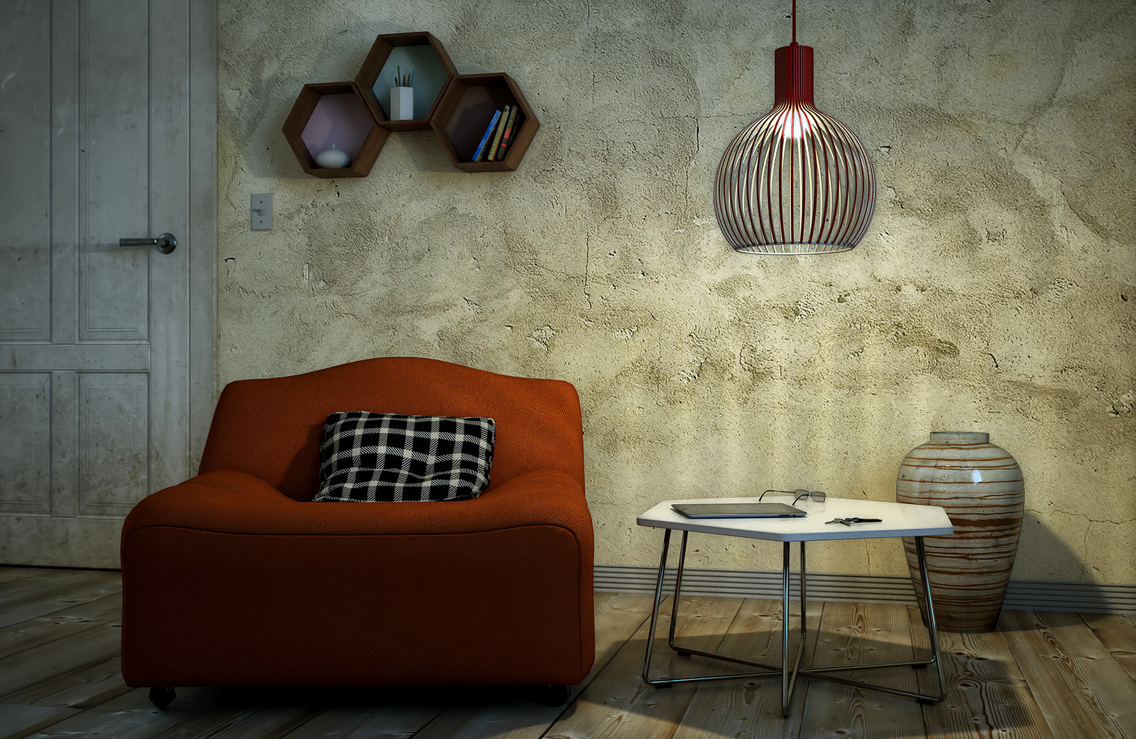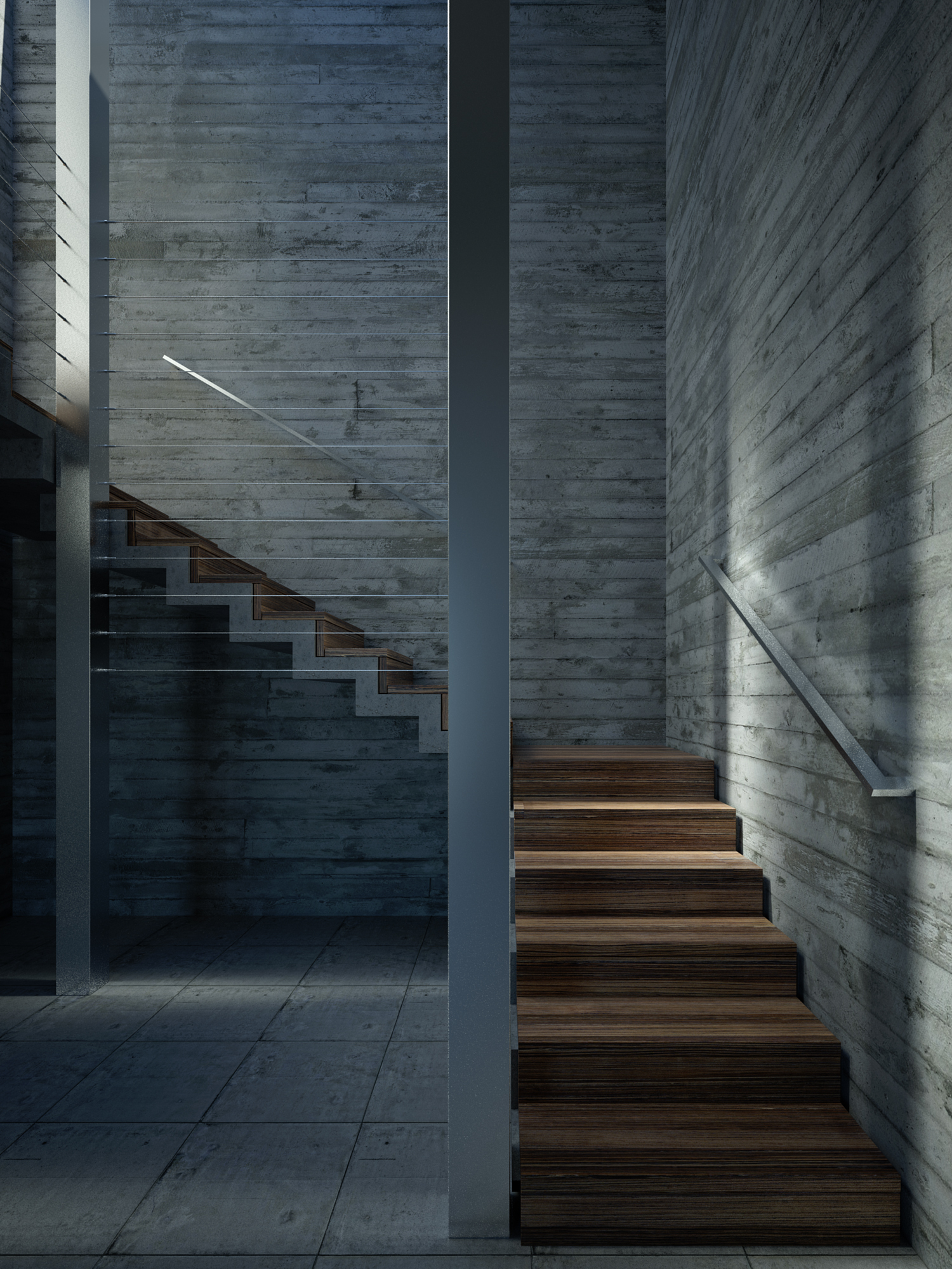 The lighting is perfect: maybe you could play a little with concrete textures and make it more shiny here and there, since the wooden paneling for the concrete results somewhere in more flat and therefore not bumpy areas.