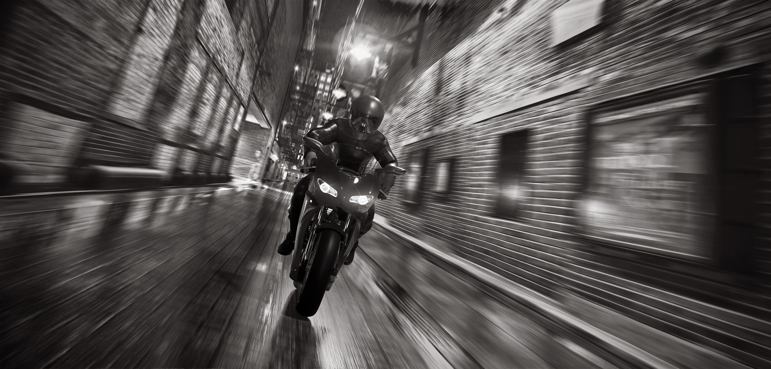 only comment I have is the motorcycle and rider seems too clean / dry for the scene, the scene has a "wet" look, thus I'm sure there would be some sort of spray from the motorcycle and fine streaking droplets on the motorcycle and rider.