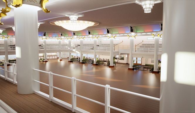 - I haven’t used portals for the dozens of external windows – the sunlight seems to be secondary. The space has a very dusky and under-lit feel to it which is precisely the way it was in real life. But at night the many lights and coloured fluros created a “veritable fairly land” according to eye-witness accounts. Night-time renderings confirm this impression.