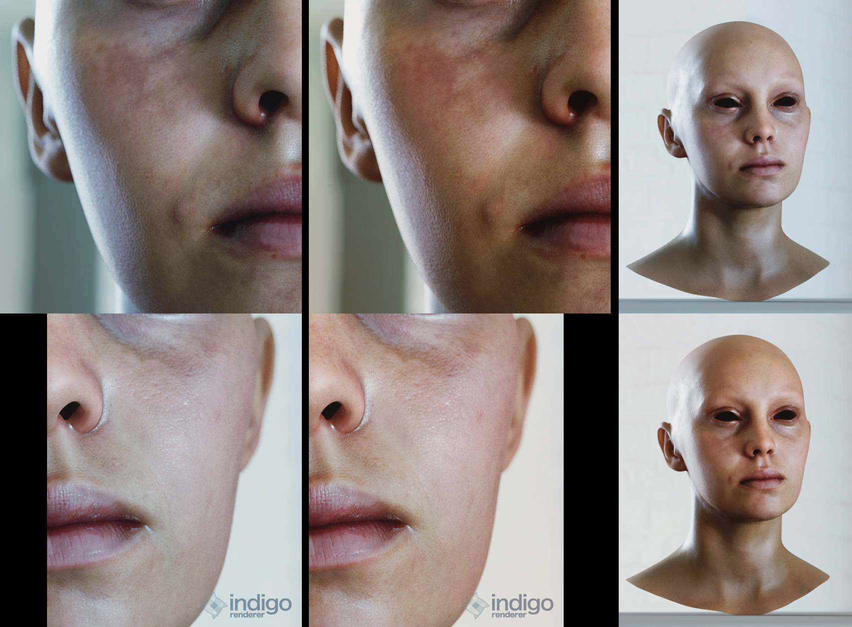 sss fast test first attempt to skin in Indigo ( i need more time to know how this works )... i use coating with roughness + fast sss with color map and medium basic with absorption and scattering settings + displacement .