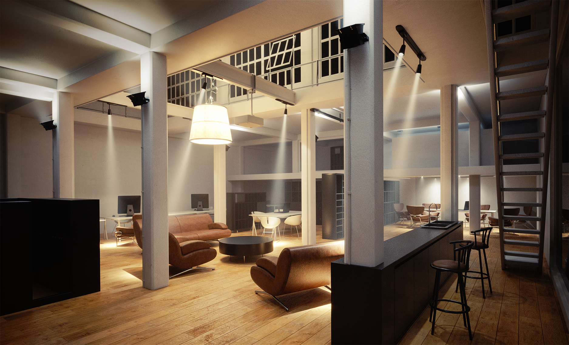 Wow, nice one! To make the room feel more cozy, I'd make the light sources warmer, increase the contrast slightly, and lower the centre of gravity for the lighting slightly by toning down those highlights in the ceiling. Something like this