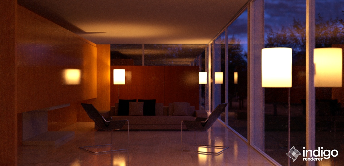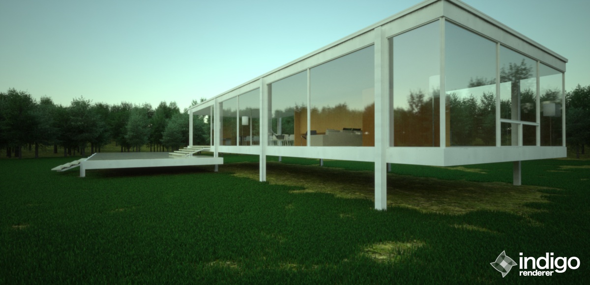 For the architectural model, I chose the Farnsworth house because there are a lot of very nice renders of it and photographs to compare with. The model of the house I am using was made by Peter Guthrie and it can be downloaded from his blog. My heartfelt thanks to him for sharing such a wonderful detailed model. He made a number of very realistic visualizations using the same model.