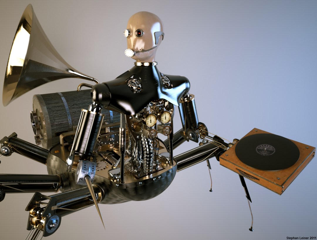 What a gorgeous piece of art! And even without being rigged, I can perfectly imagine him moving around and moving his huge needle very elegantly onto the disc, as all the details seem so well-thought of... what is it he's playing btw? And what is inside his tank?