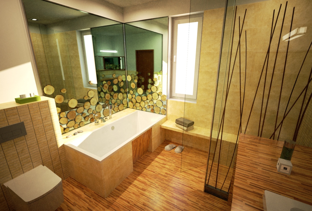 here's my latest render. Because of the wood-like-tiles on the floor we decided to add some real wood stuff, like wood slices on the mirror (covered with glass surface) and sticks inside showerwall. What do You think?
