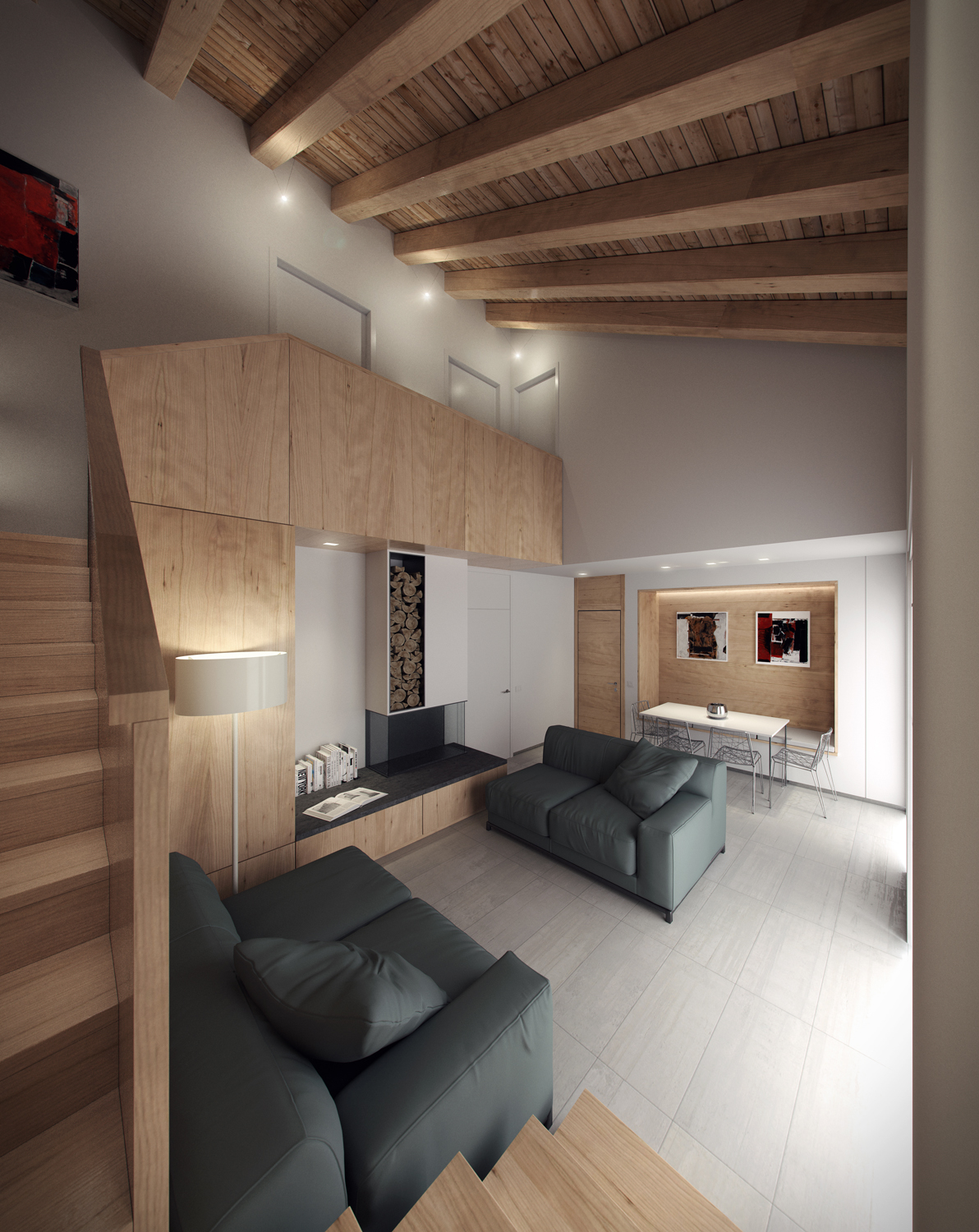 About the chimney, I don't know anything about them, it's the first time I model one from scratch. I drew inspiration from some real fireplaces I found on the internet. Some of them are purely esthetic, so no warm fire will ever come out of them. This may be one of them. The wood storage above the fire is my idea, actually, given the fact that some manufacturers guarantee the perfect heat costriction inside the glass box. The vertical white part is actually the vent, which has a curve before approaching the balauster and gets inside the rooms' wall, and then exits onto the roof. I don't know where are you from but here in Italy this is nothing new: we usually use brick for interior walls too, so there is no problem inserting an exhausting vent. We usually use concrete prefabricated bricks to host the vent and drive it to the roof.