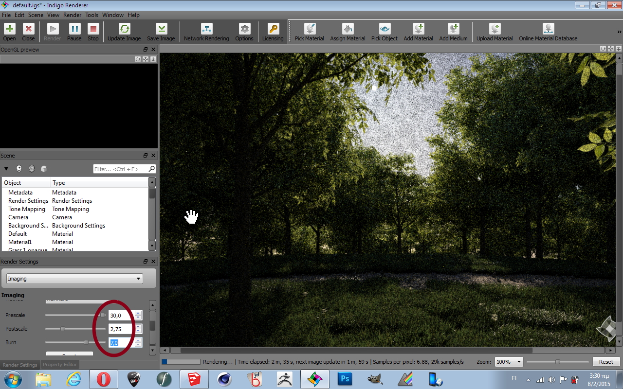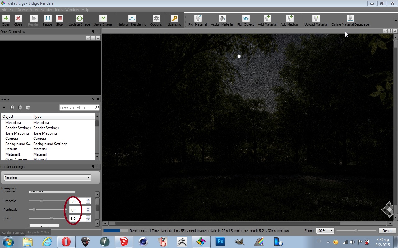 Thank you again for your comments! I' ll put the scene if anyone cares to use it..! And one last thing. I noticed that if your camera faces directly the sun, the level of brightness decreases a lot. For example I put reinhard prescale at about 30. Don't know if this is a feature of Indigo, or a bug. here are the examples.Oscar J wrote:Wow, nice glare! I was so sure it was post-prod. You should do more of this nature stuff! :D