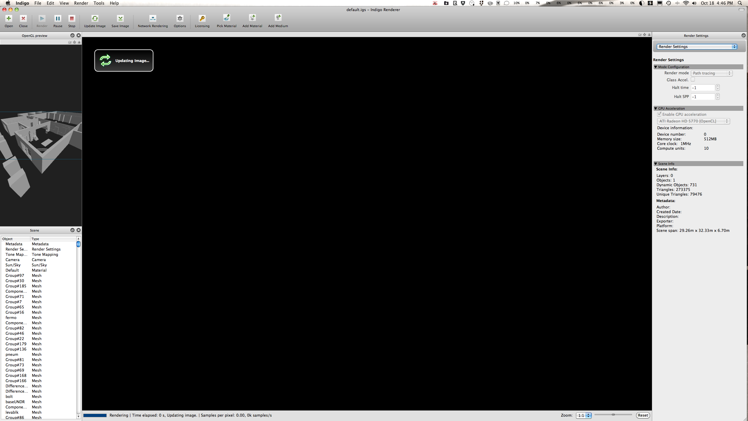 I'm having trouble rendering with GPU acceleration. When the option is activated (from either the Skindigo or Indigo interface), the render seems to freeze just before the first image update occurs. No errors, just no activity. If the option is not activated, the scene renders just fine. See the attached screen shots of both scenarios.