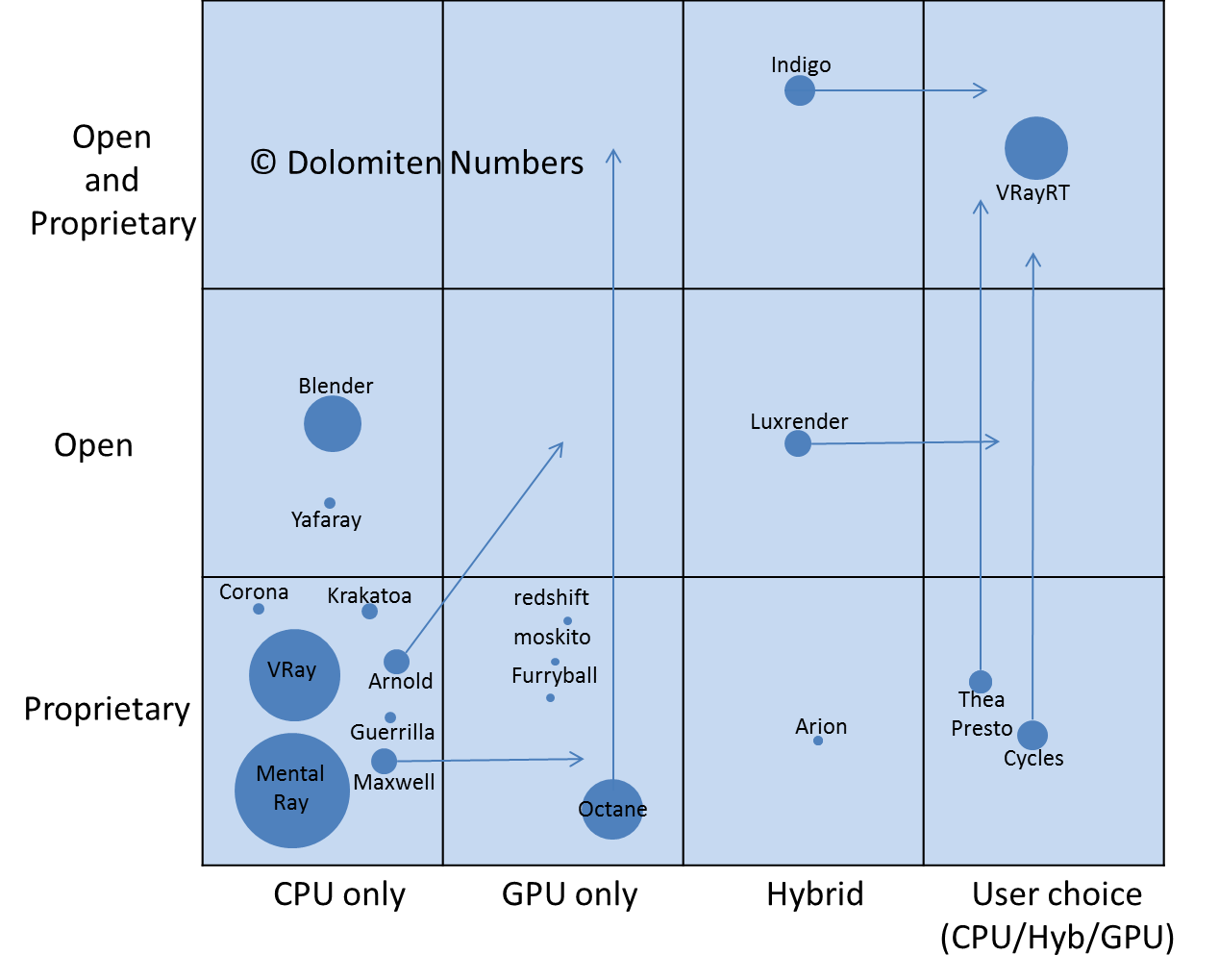 Size mean their market strength based on their availability of plugins, web hype and render farms that adopt the specific renderer, left axis is the availability on only closed or also open execution framework, bottom the render mode.