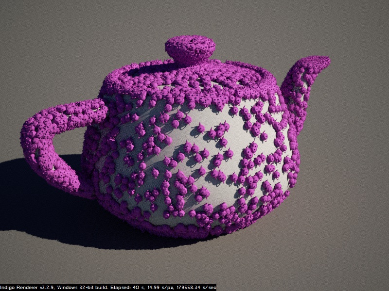 However, parametric surfaces combined with a scatter tool should handle this very nicely. I plan to add a scatter shader into Indigo, which would basically scatter instances over the surface of some target object.