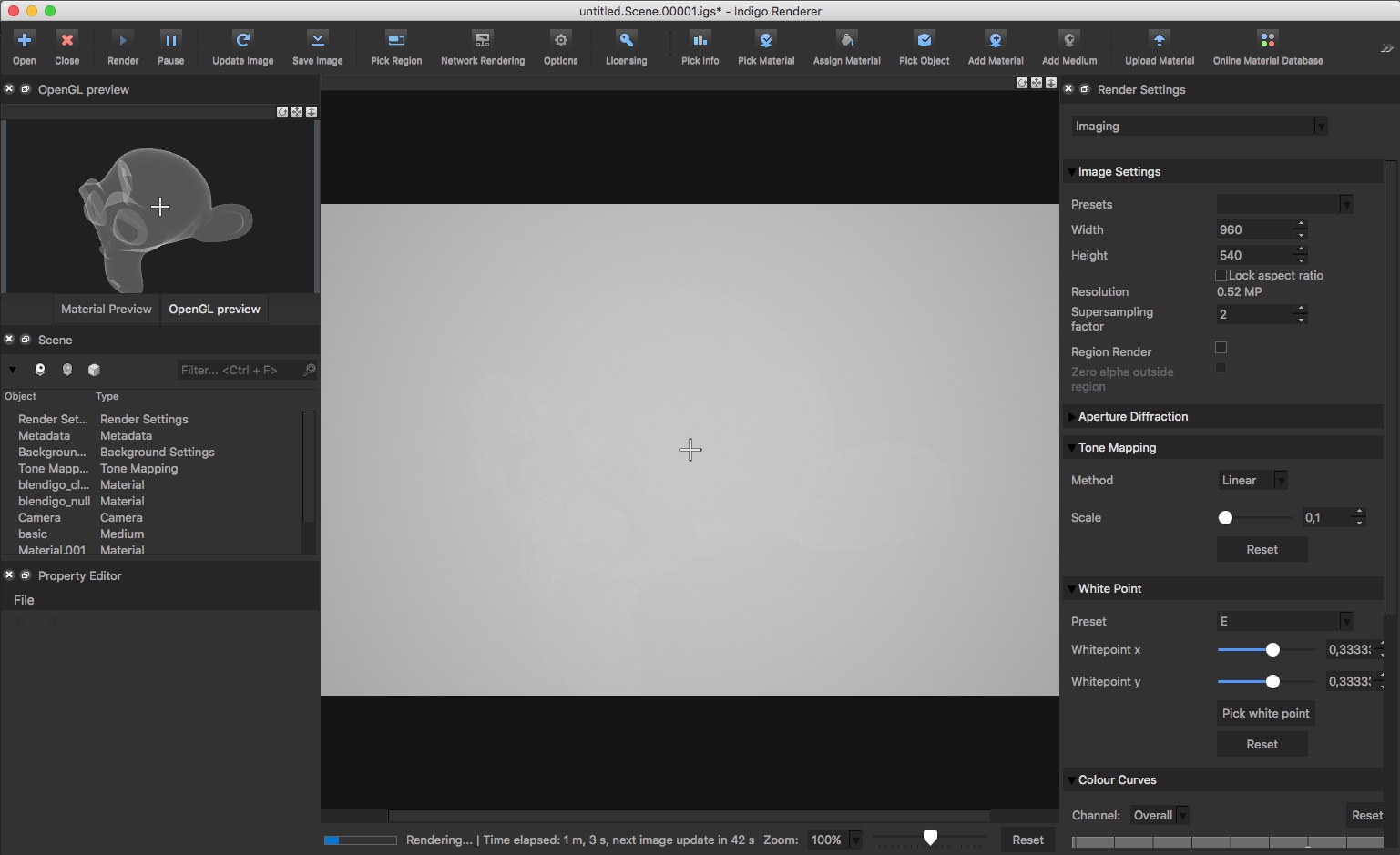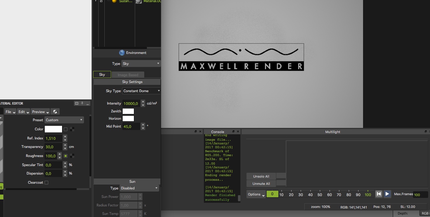 Rendering a glossy transparent object in a uniform environment is a good way to make sure they follow the laws of energy conservation. As you can see Indigo (CPU) renders the glossy transparent monkey pretty much exactly homogeneously with the uniform background. As does Maxwell, after a very long rendering time, at least fairly close.