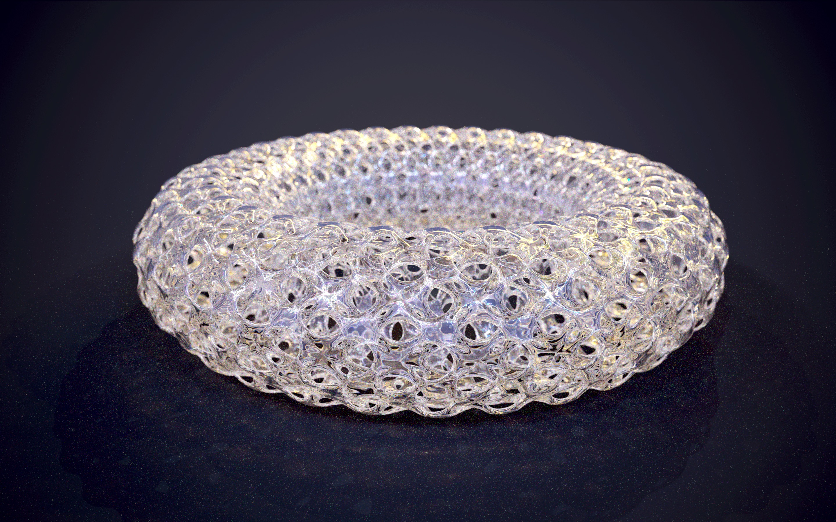 This is a complex object and even when rendered with "normal" materials takes a while to "clean up". However, nothing beats the visual complexity of glass materials with couchy B. The object is lit by a 4k HDRI form HDRI haven called the Shanghai Bundle https://hdrihaven.com/hdri/?c=outdoor&h=shanghai_bund
