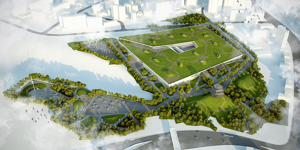 solarray: The 'suckers' on the rooftop are fairly large oculi that sit over vertical circulation elements below and let light in during the day. By night they radiate light from the interior, hence the floodlight effect. The idea behind that building design was that the landscape/greenery is lifted off of the ground, and the mixed-use centre is tucked in under it, with a very transparent and light cladding.