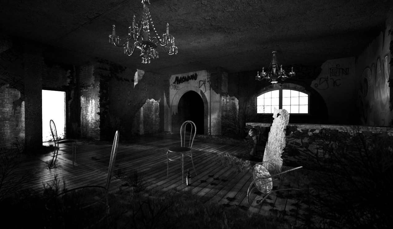 Bosseye, great stuff so far. There is almost an irony in the derelict environment and then the pristine chandelier in the middle. If that was intentional, then great idea! You could probably capitalise on that with some macros... - ahem - I think I have fuelled my fellow competitors enough...