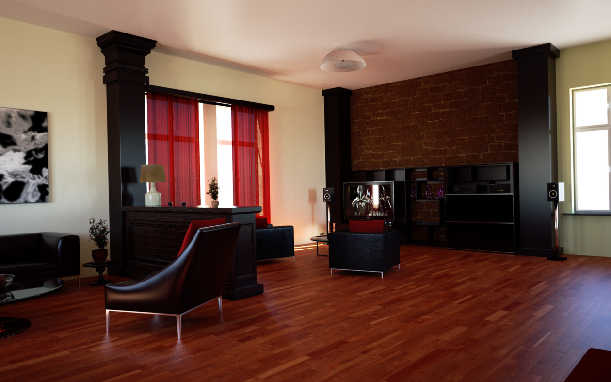 I focused on the TV set area of the scene and tried to create some filled "lived in" area that isn't so organized like usual catalog shots and ArchViz renderings...