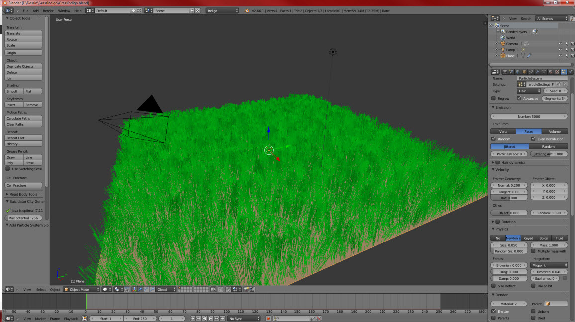 In the case of random scattering over a surface, the particle system could be translated to an indigo_scatter node, density(/size iirc) texture/shader included.StompinTom wrote:Yes, that's correct. It requires you to switch to Blender Internal to reveal the texture settings, though, something that the Blendigo devs may want to look into freeing up. Activating Indigo hides a lot of the texture functionality that Blender otherwise has.Polinalkrimizei wrote:Blender spreads the grass meshes around the surface as you wish, e.g. controlled by a density map. Blendigo exports the meshes as instances afaik, and most of the time three or four light meshes are enough.