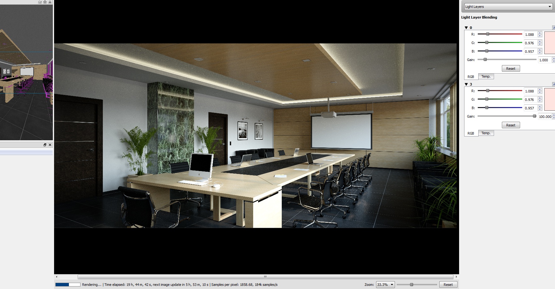 . First of all I done directors office, meeting room and office. But as always I have some problems with render quality, what I mean is the sharpness, that HD look of a render. While indigo is still working the render really looks HD (I am uploading the prt scr) but once I save image (in any format) it loses that sharpness, it's like it get blured or something. Anybody know the trick or had similar problems? The second problem is exposure of EXR map in shots toward windows, do you know anyway to get interior and EXR in some reasonable balance?