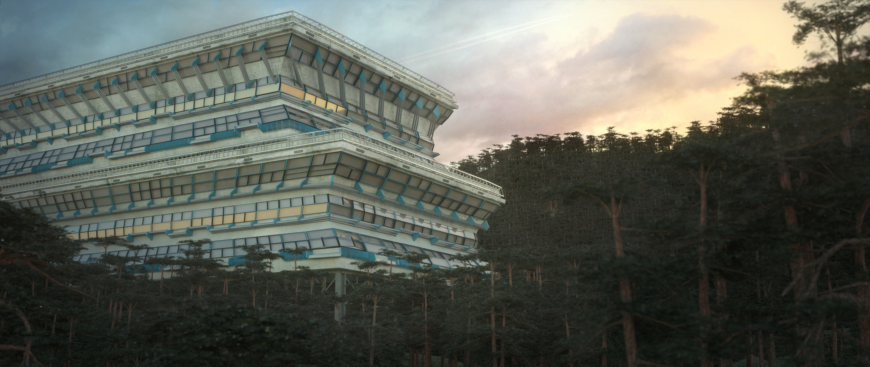 also the building is pretty cool! looks very 70s eastern europe style, hidden somewhere in the woods and now forgotten... did you assemble it manually or is it some fancy tool in C4D that did the trick?