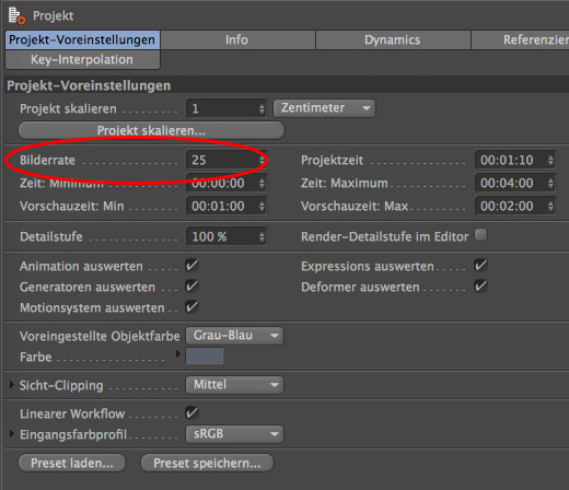The animation is based on 25fps; in C4D project timebase, render timebase and an output timebase of 1.