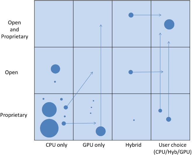 Size mean their market strength based on their availability of plugins, web hype and render farms that adopt the specific renderer, left axis is the availability on only closed or also open execution framework, bottom the render mode.