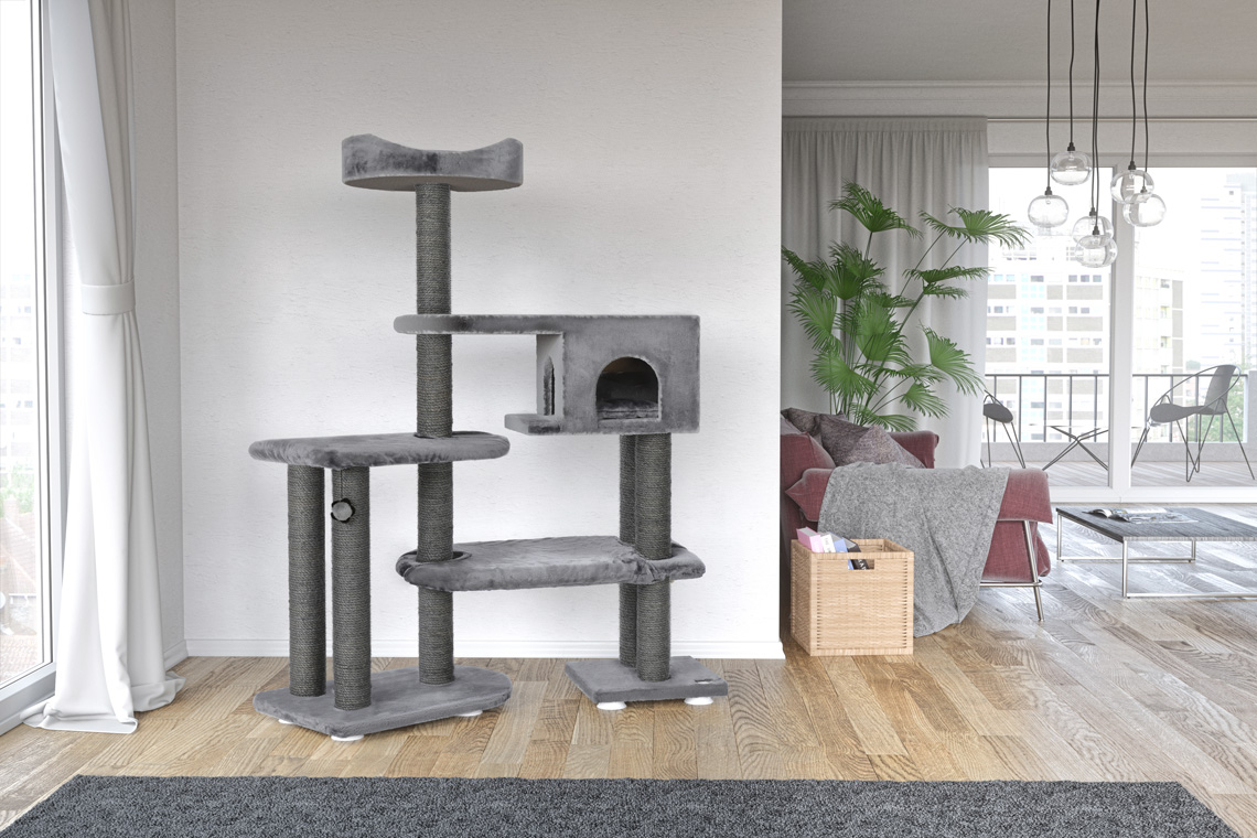A interior to show off products like this "cat tree" made for a pitch. The cat tree itself was "painted" over my rendering (that had a 3D dummy of the tree) in 2D based on a photo. The retouch was not done by me: