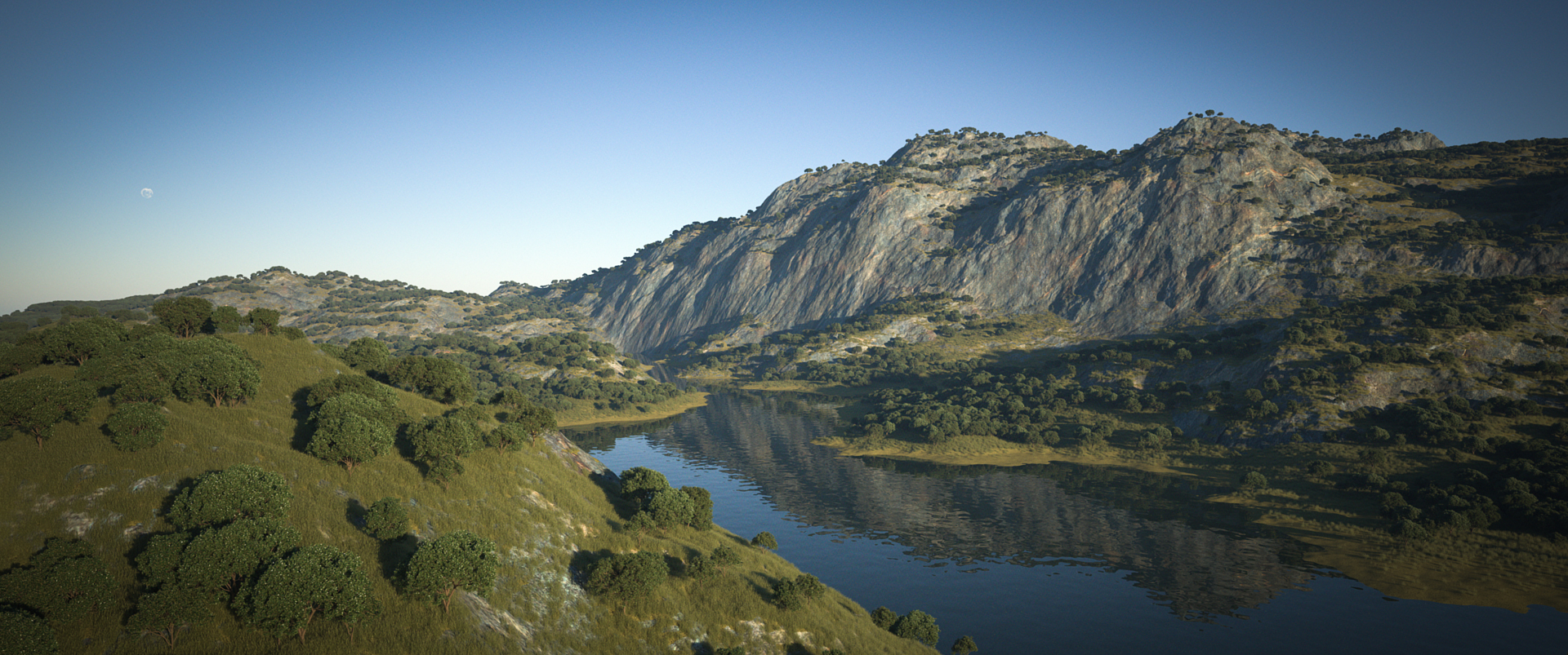 Contegufo, I use houdini for the landscapes because is at the moment the one that allows me to extend the space. I try large landscapes since the beginning and the multifractal asset that I found in a course of CMIVFX is very powerfull for this purposes. For the vegetation I´m using Surface Spread, yes.