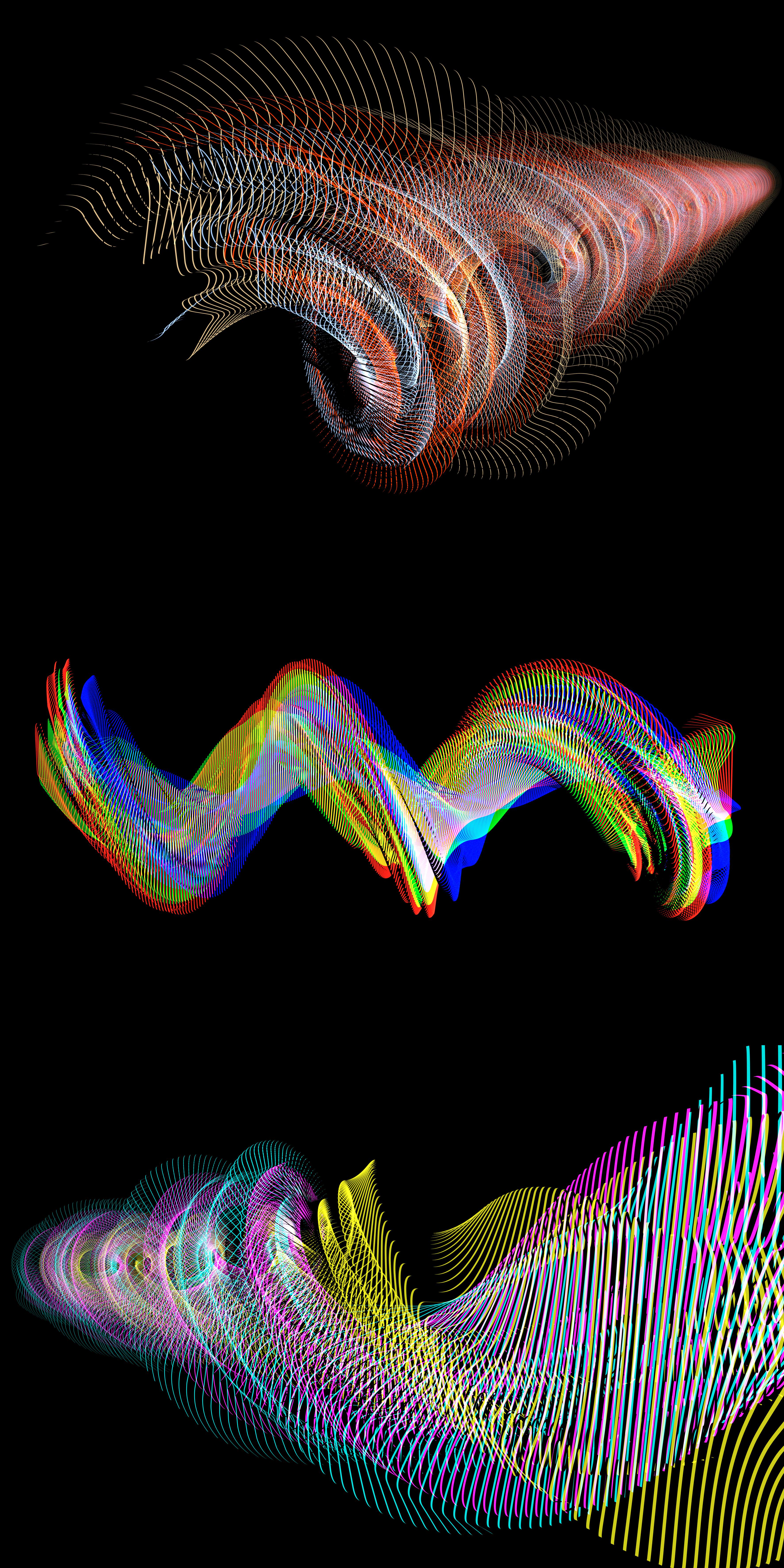 Because of a strange behaviour when you apply a specular material to a poligon, the ribbons of light are transparent for the normal direction and black for the backside. This gives certain beauty to this images. Like anecdotic thing this compositions don´t work for v4, the ribbons are transparent). I tested this weekend too another way for an op-art composition. I can´t render it with indigo, is mantra, the inside render engine of houdini. Don´t be cruel with this little babies,