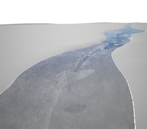 By the way, the fast way to render this, would be to use a phong material with high exponent/low roughness for the whole ground. Then set fresnel_scale to zero outside the water region, and to one inside the water region.