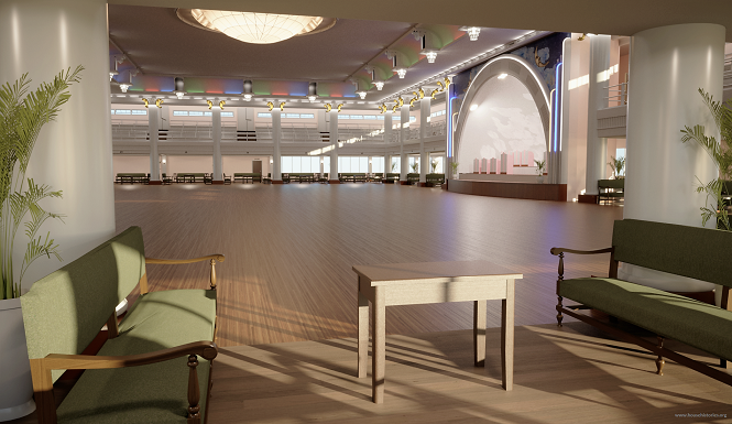 The final images and full back-story will be published here in due course. As a quick intro, this a historical recreation of a famous dance hall built in the early 1940s and demolished a few decades ago. Obviously, I want to make the renderings as photo-realistic as possible and although I’m fairly happy with the current version I still think that it has “cartoonish” feel. Something about the colour saturation, I’m not sure what. I’d appreciate your thoughts on how to “up” the level of realism.