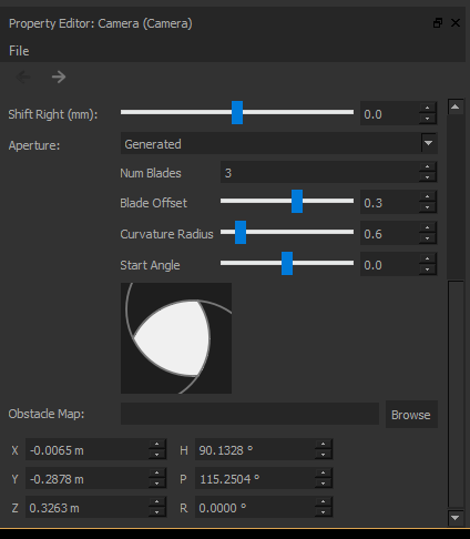 * Added aperture UI controls in the camera properties, added preview image of aperture and obstacle map.