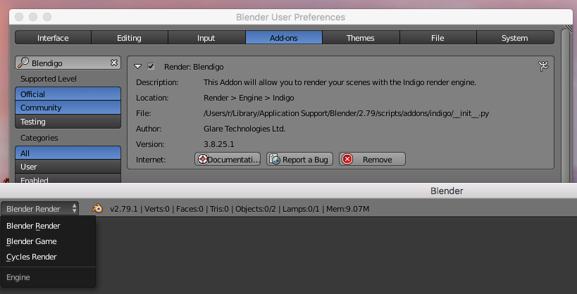 Hi. I just discovered this days the Indigo renderer and wanted to test how it is working with Blender but unfortunately I don't have the Indigo as render option after installing Blendigo add-on for Blender.