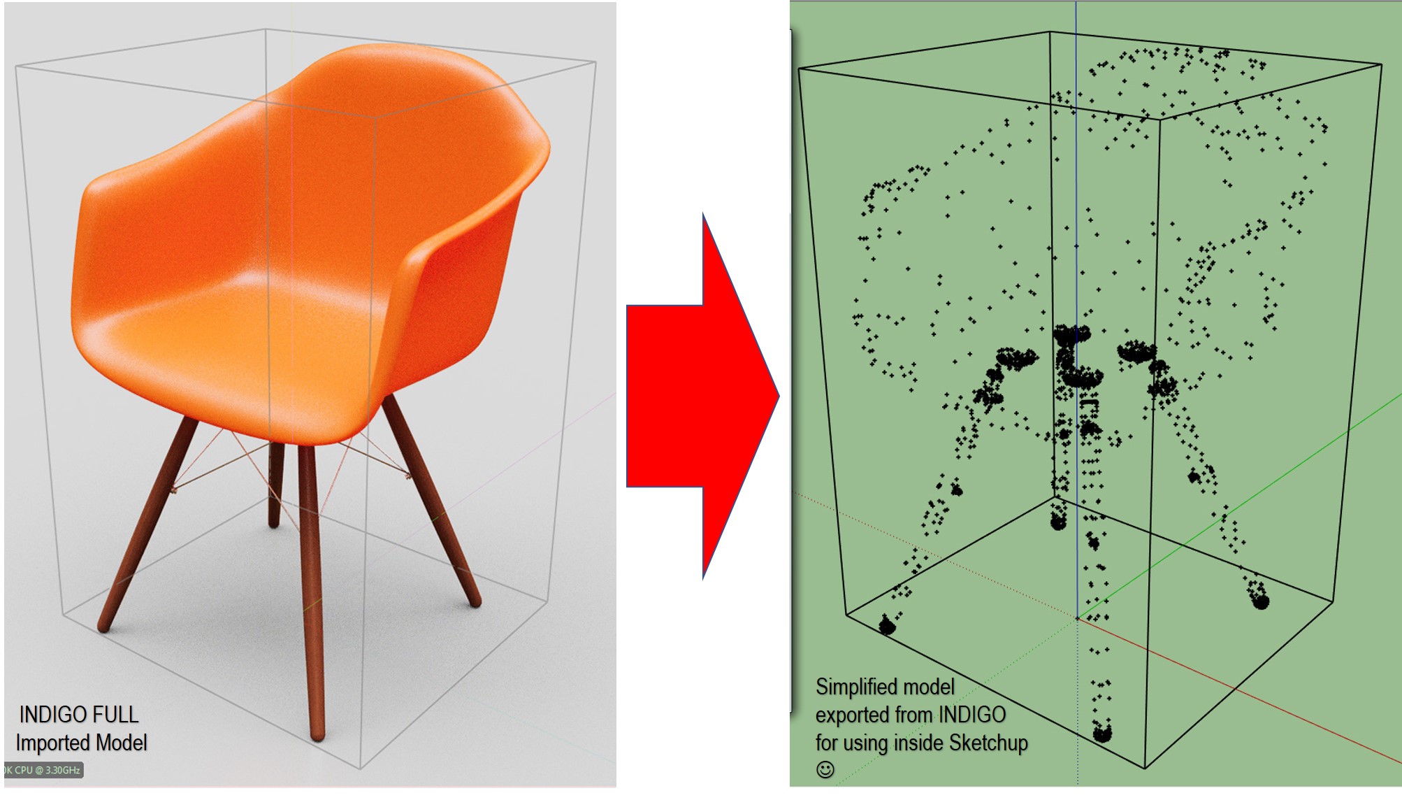 I'd like to suggest for next Skindigo releases to implement a different way to display the imported linked geometry , something like empty triangles, lines or dots that reprsents the shape of linked .Obj file. It is kinda complex and time consuming to imagine what you will get by only placing empty boxes all over the scene, so, it comes to my mind the next workflow : To open/import an .obj file in the INDIGO Stand Alone, edit materials and once is done, save the file to use it in Sketchup ( and also being able to edit materials, scale,rotate the geometry , etc, inside Skp , like any other Skp model