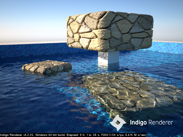 I decided try this classic scene out again, and the underwater bits were a bit slow to resolve, with a low sun angle, using the captured simulation, but started to show up after 10000 samples per pixels.