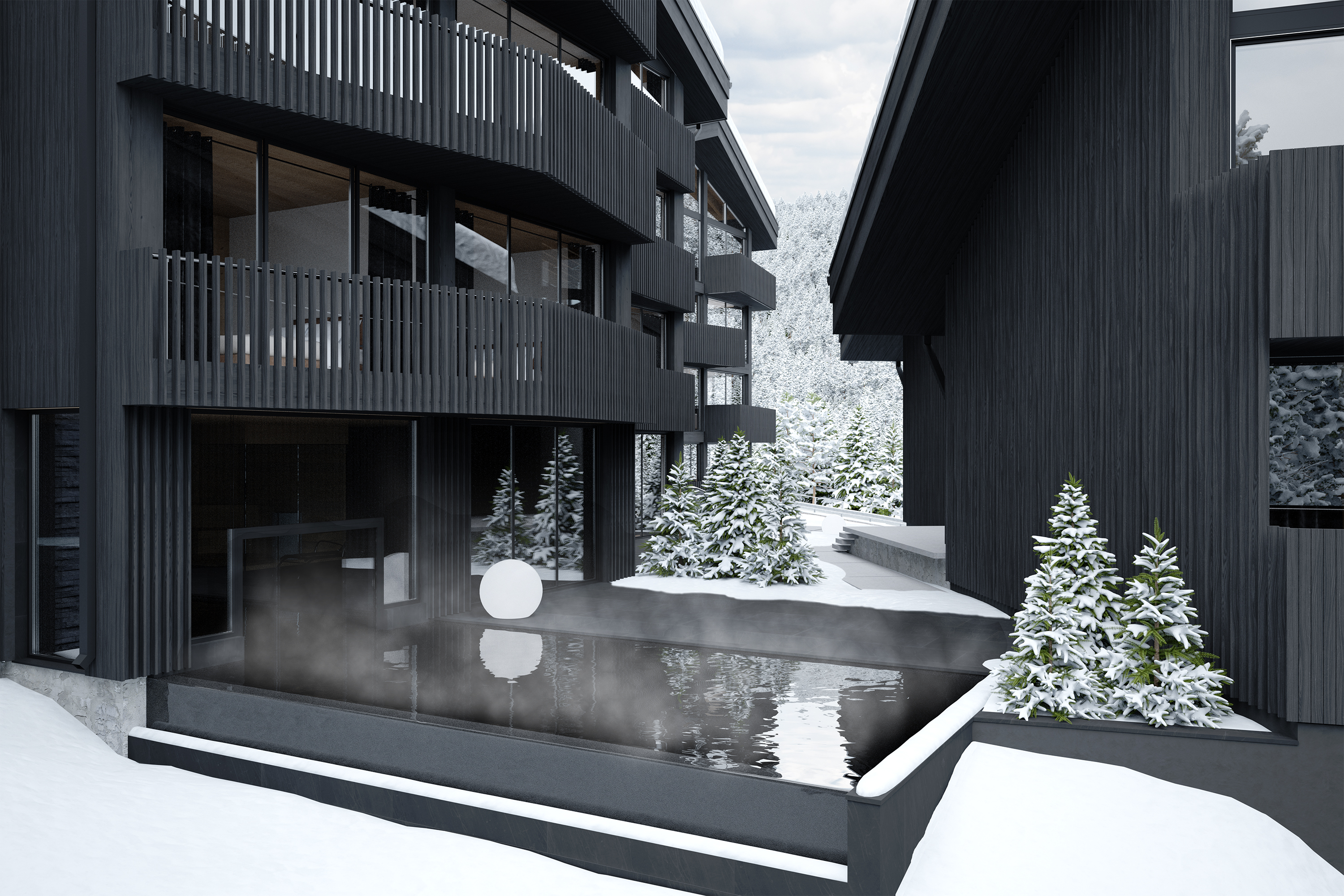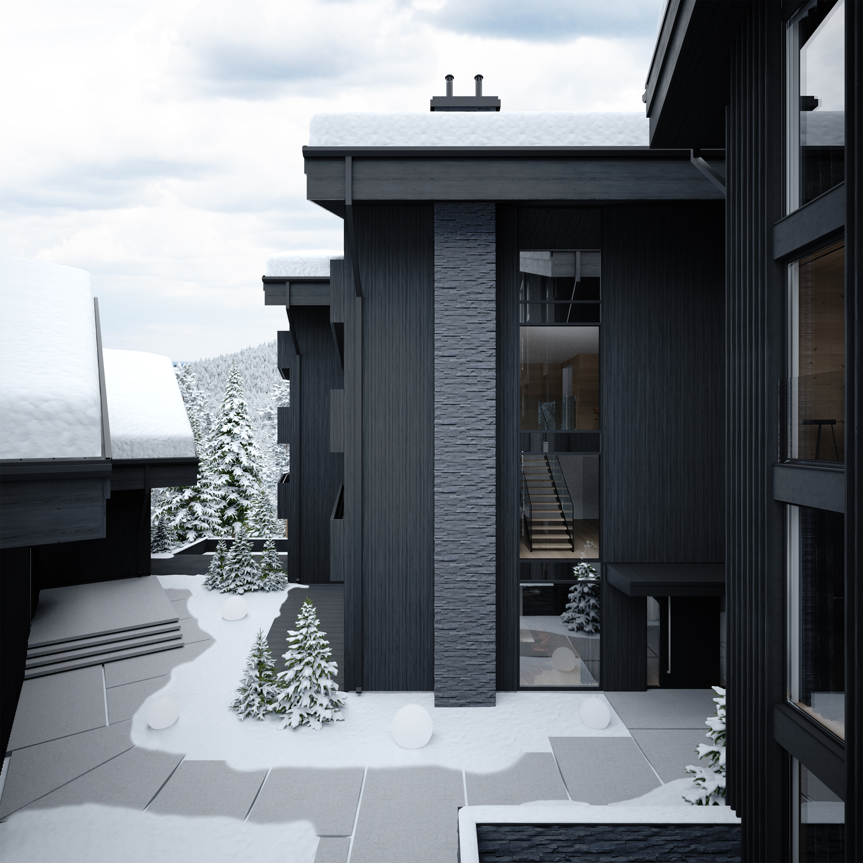 here is my, so far, career project! It is apartment complex in Laax, Switzerland, the project task was to plan and design, both exterior and interior, two new buildings and one addition to existing building in mix of contemporary and swiss-french chalet styles.